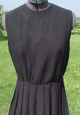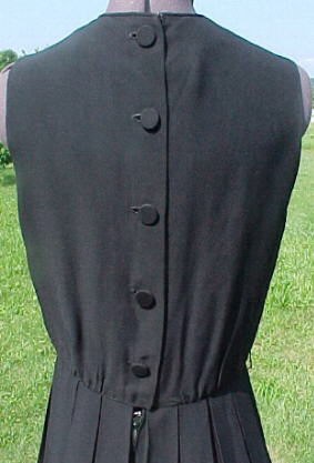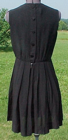 A very simple jet black 1950's dress with short pleated skirt. �Made of crisp rayon. �Five back buttons plus metal zipper. �Apparently had a matching belt at some point, but alas, it is no longer attached. �Loops could be cut or a new belt could be added. �Clean, classic cut. �Cute kicky skirt. �Inside label reads "Lot 55, Size 5". Also has "ILGWU" label.