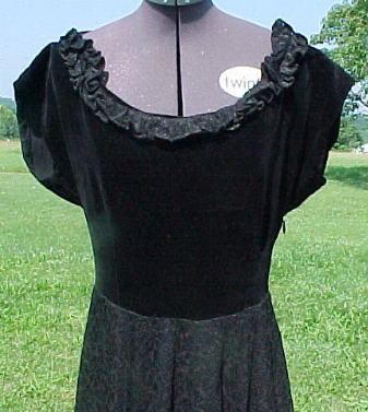 A beautiful 1940's jet black velvet and lace dress. �Band of ruffled satin around generously scooped neckline. �Side metal zipper. �Both velvet and lace are still quite black and in marvelous condition. �Beautiful vintage dress. �No inside labels.