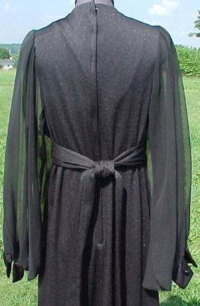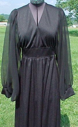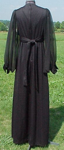 Wispy, witchy 1970's black chiffon and jersey knit gown. �What's considered "goth" today was simply "cool" back then. �Jet black color. �Knit is in excellent shape with minimal pilling or snags. �Inside label reads "Lot __, Size 12" with washing care label that says "Hand Wash Separately Cold Water �Line Dry".�