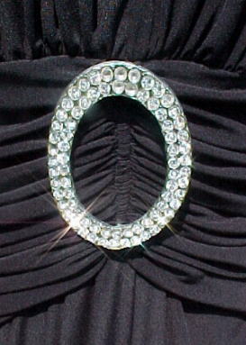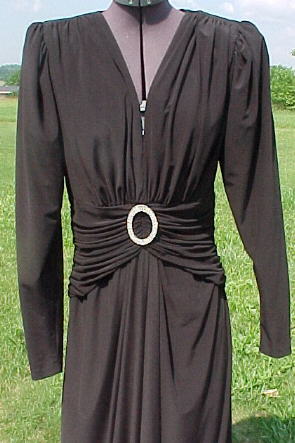 A late 1970's/early 1980's lightweight crepe dress with rhinestone buckle. �Although the photographs make the dress appear more of a brown-black, it is very black. �Low V-cut neckline. �Beautifully gathered waist sash. �Back zipper. �Inside labels read "Rimini" and "Lot 12, Size 10". There is an "ILGWU" label, and care instruction label which says "Dry Clean Only".