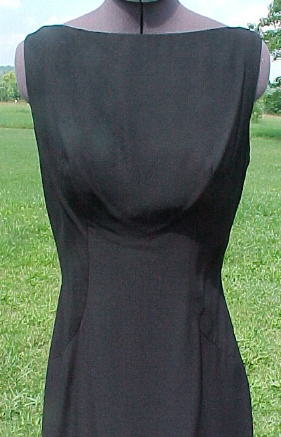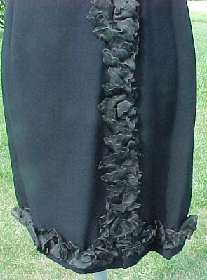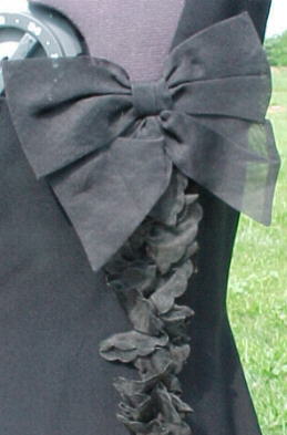 Wonderfully fitted 1950's rayon dress with organza ruffles and bow. �Extremely feminine. �This saucy little dress would certainly grab everyone's attention when you walk into a room. �Great shape to it! �Back metal zipper. �In excellent condition. �Inside labels read "Lot __, Size 7" and "ILGWU" label.