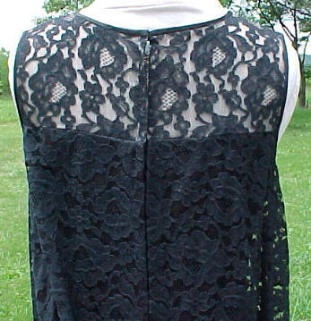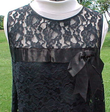 Cute little 1960's black lace dress with satin lining and bow. �The lace's color has diminished to a very deep, dark navy blue, rather than a jet black. �Still quite pretty and the very slight color fade is only noticeable in bright sunlight.� Back metal zipper. �Inside labels read "Lot 12, Size 7" plus "ILGWU" label.