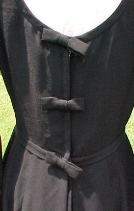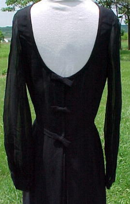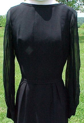 Lovely 1950's crepe dress with back bows for added interest. �Still quite black and in excellent condition. �Very chic. �Billowy long chiffon sleeves with 3 covered button-&-loops. �Bateau neckline in front but generously scooped in back! �Back metal zipper. �Fully lined in satin acetate. �Inverted center back pleat for walking comfort. �No inside label.