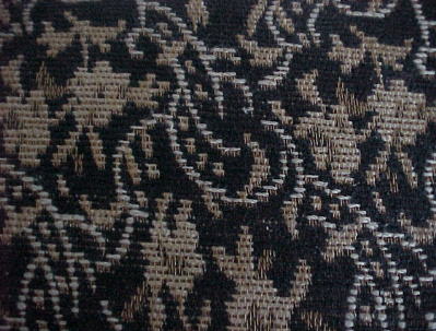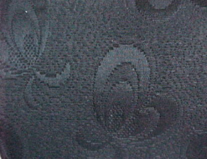 Circa 1950's black cocktail purse. �Made of an embossed, almost brocade-flavored, fabric ~ this purse sports an adorable little bow atop the double-strap handle. �Looks just like something Audrey Hepburn or Jackie-O would have carried! �In mint condition! �Close-up of fabric (right) has been lightened to show the pattern. �Inside open pocket plus 2nd zippered pocket. �No inside tags. �Overall measurements are 7 1/2" wide x 6 1/2" tall. $50.00�� |
