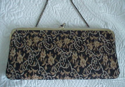 Marvelous woven tapestry purse!. �Circa 1940's/early 50's. �In excellent condition ~ all satin lined with twist clasp and hide-a-way chain. �Black satin lined. �No inside tags. �Overall dimensions are 11" wide x 5 1/4" tall. $38.00 � |