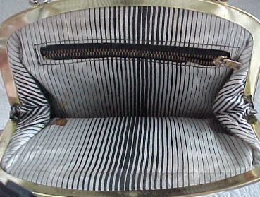 Faux leather 1960's handbag with grapevine bar. �In marvelous, immaculate condition. �Very smooth outershell is mark-free. �Accordion-pleated bottom. �Inside tag says "Theodor California". �Lining is immaculate and has an open pocket plus a zipped pocket. �Never used ~ one pocket still has it's inspection stickers which say "Inspector No. 51". �Overall dimensions are 9 1/2" x 8 1/2" ~ not including handle. �Fabulous purse! $28.00 � |