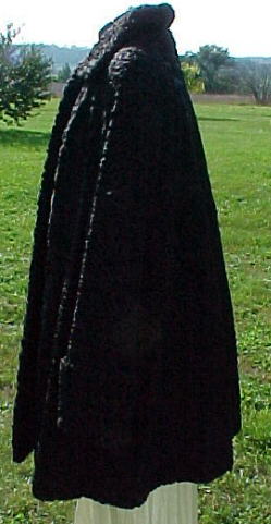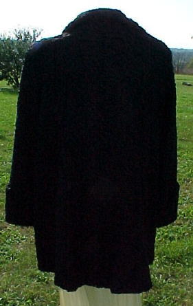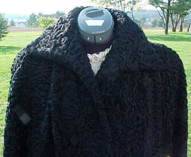 Black is always difficult to photograph properly and this coat was particularly difficult! �Genuine 1930's/40's Persian Lamb swing coat. �In MINT condition ~ was very well taken care of. �This fur coat flairs out at the hemline, giving it it's swing status. �Large flip-up collar. �Coat fastens with 2 very large hook-&-loops in front. �Lined in black satin. �Built-in shoulder pads. �Has embroidery inside that says "Emilie L". �The main label reads "Auerbach's, Salt Lake City". �Just beautiful!!