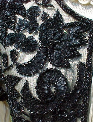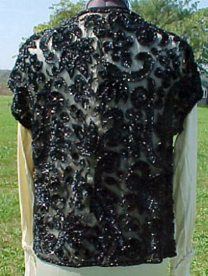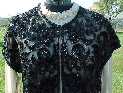 Gorgeous all-beaded evening jacket. �Slit up the front, it has one little hook at the neckline. �Cap sleeves. �Very heavy for such a small jacket. �In excellent condition and very sparkly. �Deep black, so it will go with any color gown that you choose! �Because of it's open design it would be ideal over a maternity outfit as well! �Inside label says "Made for Stix Baer Fuller in Hong Kong, 10, 100% Nylon".