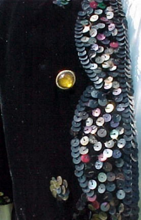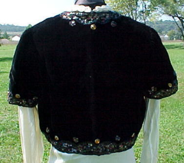 Fabulous 1940's (could be late 30's) velvet, sequin & jewel bolero evening jacket. �The velvet is in unbelievably good condition. �Worth adding to your collection or wearing for a night out on the town. �The only inside tag is a very tiny one that says "16". �I cannot imagine that this was a SIZE 16 because it is small ~ would most likely fit a modern size 6-8. �Deep black velvet has no rubs or missing flock. �No missing jewels either. �Fully lined in black acetate.