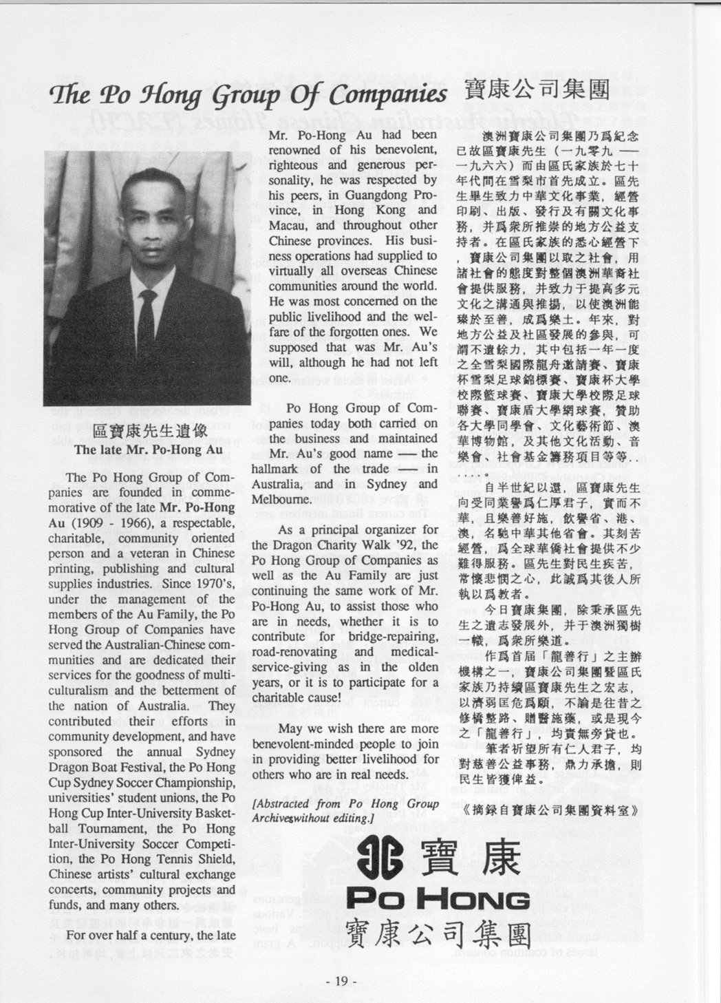 | About Mr Po-Hong Au, the Po Hong Group of Companies and the inaugurated "Dragon Charity Walk" 1992. [click here] | |||||||||||||||||||||||||