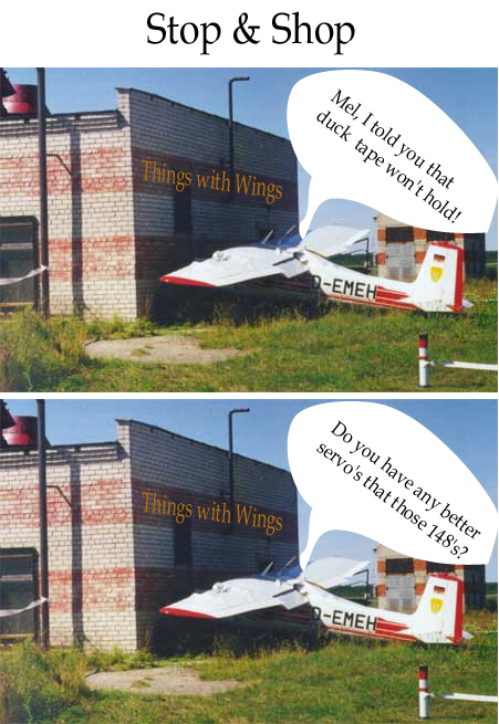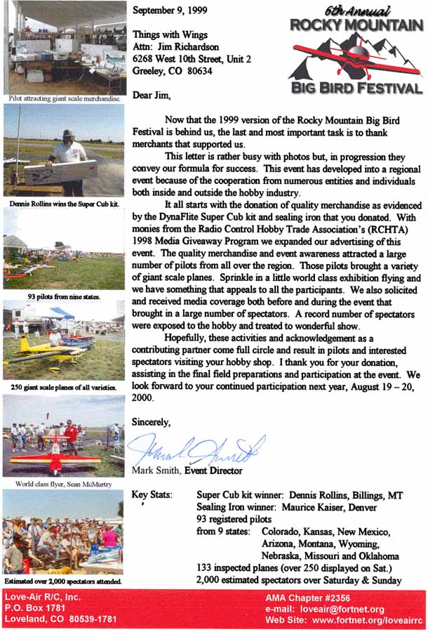 Things With Wings is a full service hobby store dedicated to the airplane and car modeler. We carry a complete line of aircraft from the smallest RC trainer to the largest pro aircraft.We also have a huge inventory of RC cars , both gas and electric. If your in the area stop by and see us. If not drop us an Email. We look forward to serving your hobby needs and look forward to seeing you at the field. Happy Flying!!!!! THINGS WITH WINGS 6268 W 10th St. #2 Greeley, Colorado 80634 Email [email protected] Thanks to Frank, Mel and John for the Big Bird PICS. | Planes Motors Radios Covering | |||||||||||||||||||