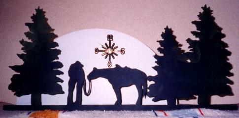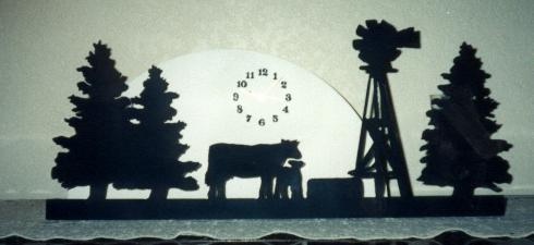These mantle clocks are 26" long, 4" wide, and approximately 12" tall. Clocks operate on 1 AA battery. They also have two votive candles mounted on the backs of the trees. The clocks are available thru Young's Western Wearhouse in Valentine, Nebraska . Many other designs can be put into these clocks. Price $200 each.