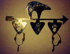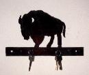 This rack is the first in my numbered series. I also have a buffalo. This picture really doesn't do it justice. It is 26" long. Mounting holes at 16". It has 4 hooks. Three 2" hooks across the bottom of the arrowheads and one 4" hook at the top of the center arrowhead. It has a fire finish, which bring out golds, blues,reds, and purple. I then sealed it with a clear finish to prevent rust. This one is my favorite.