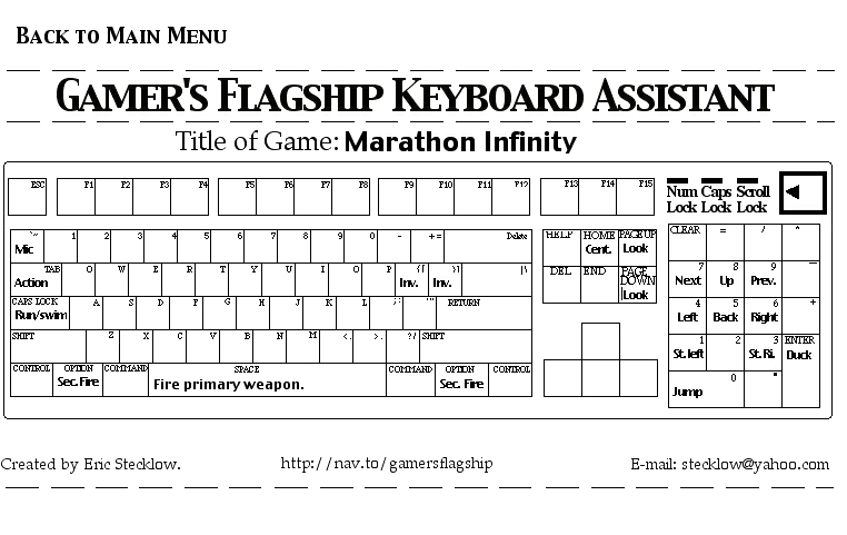 August 27, 2000 I finally found the time to update. Well, I have more information on the utility that I was talking about. Whenever I get a new game, I go through that phase of learning the keys. Usually it isn't all that hard, but it can be really difficult if the game uses a lot of keys (such as F/A-18 Hornet). This is the problem I am trying to tackle, with a program that can help you memorize them quicker. You will see a picture resembling your keyboard, you type in what key does what, and you print it out. You can rest the page near your keyboard, so if you forget what a key does you can glance to see what everything does. It is in a fairly early stage, and if it were to be released it would probably be a week or two from now. Notice I said if, I have run into some problems while making it, problems I'm not sure can be overcome comfortably. Therefore, this is all very tentative. I also want it to support some joysticks and some other devices. The following two screen shots should give you a good preview: