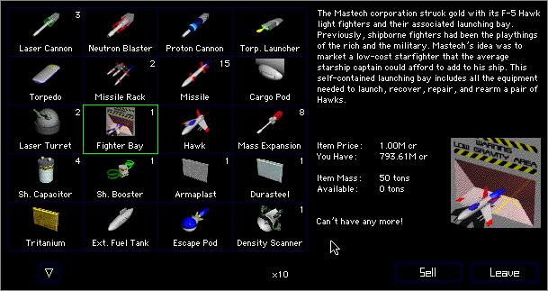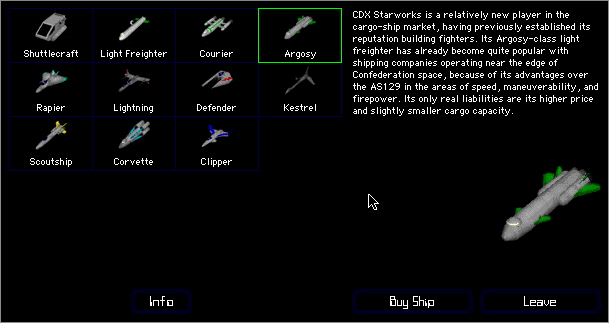 A Warship for the space cowboy on a budget A ship that I usually turn to when I'm short on money is the Argosy. When you get your new Argosy, you will need to make several upgrades since its original intention is to be a somewhat well armed freighter. There is a region of space that I reccomend to go to buy the ship and get your upgrades. First, go to the Yemuro system to actually buy the ship. ![]() ![]() I buy the ship there because close by is the Spica system, with all the upgrades you will need. For additional upgrades that don't take up space, such as the thruster enhancement and the RCS upgrade, I believe you can get them at Rebel Headquarters at Palshlife. ![]() ![]() These are the upgrades that I currently have on my Argosy: 2 Missle Racks 15 missiles 3 laser cannons 2 laser turrets Hawk Fighter Bay 2 Hawk fighters 4 sheild capacitators Sheild Booster Armaplast armor Durasteel Armor Density scanner IFF detector Auto Refueller Flare Launcher 50 flares 8 Mass Expansions The total price comes to 2.29 million credits. I don't believe the price includes the two Hawk fighters, which are 250,000 credits each. It might seem somewhat expensive, and it is. However, when compared to a kestrel which is 10 million credits, it's a bargain. It isn't a ship that I would use to take on a cruiser, but it does fine against those nasty pirates that attack in fighter groups. It's possible to take on a Frigate/Destroyer or Kestrel, but I would have some escorts on top of your fighters helping you out. Escorts that I reccomend are gunboats, ligtning fighters, and Rapiers. You have a 75% chance of taking any of these ships over when you board them, so you have a good chance of building a fleet of some strong fighters after a little while. Your sheilds are still somewhat weak, so you don't want to really do a lot of head on fighting with a large ship (except for freighters of course). The missiles and the decoy flares are suppose to help you with that, let you do more long distance fighting. I have lots of lasers so if a fighter approaches me I can wipe him out quick so he won't make too many passes. I considered getting a Tritanium armor upgrade, but that took up a lot of space. You might want to consider sacrificing something to get it, it's 1 million credits but I believe it adds significant strength. The real drawback that comes out of this is that you are left with ten tons of cargo space. Getting an escort to pick up the slack is a good idea, I reccomend hiring a light freighter if you're in the business of selling commodity items from port to port. If you are not yielding big profits the cost of keeping a freighter as an escort might be more trouble than its worth, so you might want to consider boarding and capturing a shuttle craft (or hire a shuttlecraft as an escort). That will give you 30 tons total which should be enough for any rush delivery. |