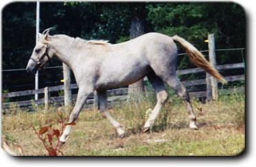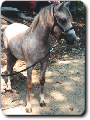 .....She came to us in the winter of 1999. Not quite two years old, she has had numerous owners and along the way had been badly mistreated. It has takes us almost a year but she has learned to trust again and is now in her first stage of under saddle training. She is going to make a wonderful children's pony, and with her fantastic movement should be in the ribbons.
