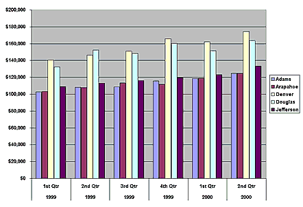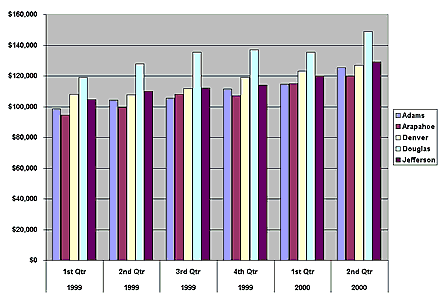 | | | | | 1999 1st Qtr | 1999 2nd Qtr | 1999 3rd Qtr | 1999 4th Qtr | | 2000 1st Qtr | 2000 2nd Qtr | | Adams | $102,716 | $108,387 | $108,670 | $115,817 | | $118,534 | $124,617 | | Arapahoe | $103,280 | $107,727 | $113,278 | $111,681 | | $118,892 | $124,917 | | Denver | $140,424 | $146,594 | $151,083 | $165,866 | | $162,049 | $174,250 | | Douglas | $132,221 | $152,187 | $148,497 | $160,056 | | $151,564 | $163,636 | | Jefferson | $109,042 | $112,967 | $115,954 | $119,548 | | $123,156 | $133,325 | (Mean) Average Sales Prices Chart