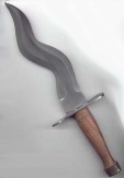Kris Knife This knife is 13 1/2 inches long (total length) and features a curved (S shaped) blade, and a wood handle. It comes with a leather kris design sheath. Item # 103 Price: 12.50 |