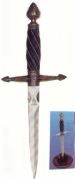 Round Table Dagger The Round Table Athame is perfect for those interested in the Arthurian legends. The overall length is 13". The handle is made of black fluted ABS with the silver plated wire wrap. The cross guard and pommel are cast metal with an antique pewter finish. A mahogany wood tabletop stand is included. Item # 110 Price: 40.00 |