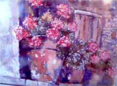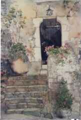 These are the paintings done while on a recent trip to southern France � ![]() 1/2sheet, metal frame, $642.00. I spotted these wonderful stairs in the Chateau Eza, in the old fortress in the quaint village of Eze. It was so incredible for painting here that I stayed in the little Restaurant Hotel at the foot of this incredible Medieval village for six days. The first night I was sketching this incredible door I met the owners of the hotel who were staying in this room. I returned the next day to complete the detailed 15x22 inch drawing and had a chance to start painting. I finished this painting in the wee hours of the morning in my room, with only my sketch, notes, and the started piece. I was amazed when I saw the photos of the door that I took. I loved the painting as it really captures the essence of the beauty that I saw in this incredible part of the world. ![]() Pot and Red Geraniums. 1/2 sheet, metal frame, $428.00. I saw these lovely pots sitting on a ledge in the old village of St.Agnes, perched up in the hills above Menton, in the french alps right by the Mediterranean just by the Italian border. I painted these back home in my studio. � |