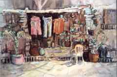 Here is my Gallery of Paintings of Mexico Many of these paintings were done while I was on location in Mexico. I love to travel to Puerto Vallarta with family and other artist friends. I have painted the quaint scenes around town and have ventured to small villages in the area such as Boca. I love to go to Bucerias just north of Puerto Vallarta to paint as it is filled with wonderful stucco buildings and beautiful flowerpots. ![]() These were my clothes hanging up in my friends backyard in Bucerias. Sold. This was the backyard at Yvonne's place in Bucerias. Sold. ![]() 3/4sheet, metal frame, $642.00.This lovely villa is just around the corner from a friend's place. ![]() Quartersheet, Metal Frame, $321.00. This beautiful gate was painted while on location. ![]() Quartersheet, metal frame, $321.00. This colorful painting was done in Bucerias. � � � � |