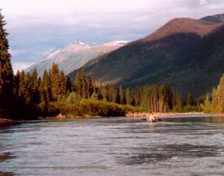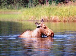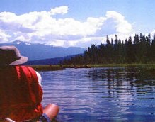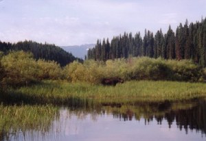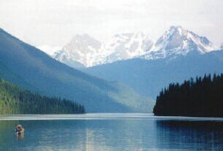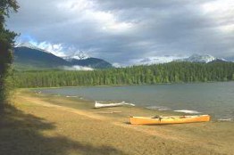 Camping on Swan Lake or on the Bowron River are usually where most people camp the last night out; making the last day on Bowron Lake a short and easy one. Early mornings in this area can reward you with "close-ups" like this picture; a moose feeding in the river. Paddling the Upper Bowron River is a slow meandering 4.0 km. Bowron Lake is a 7.2 km paddle; and there are no camp-sites on the shoreline so you must paddle to the end of the lake. Paddle along the shoreline; and it is usually calmer in the morning; as afternoon winds are common on Bowron Lake. As you approach the end of Bowron Lake many people are already planning in their mind a return trip to this unforgettable and magnificent wilderness experience.