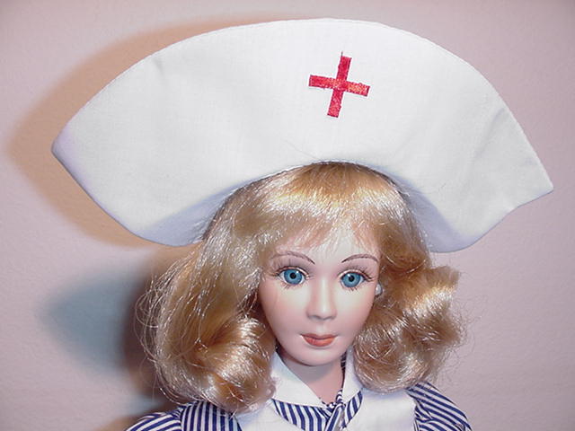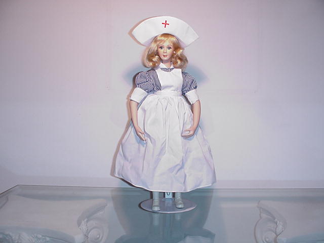 Fanny is a limited edition traditional nurse, No. 150 of 500. Her blue and white uniform is made of cotton, as is her pinafore-type apron. Her no-nonsense nursing shoes are also porcelain. She is approximately 22" in height.