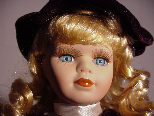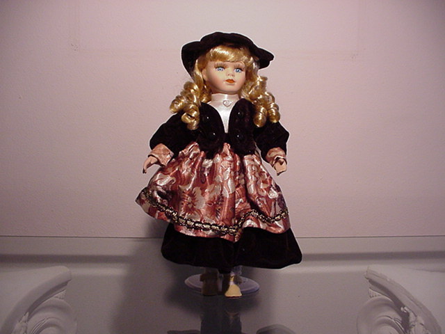 Carol is 15" tall and has blonde hair and blue eyes. Her dress is of rose and russet brocaid, trimmed in velvet.