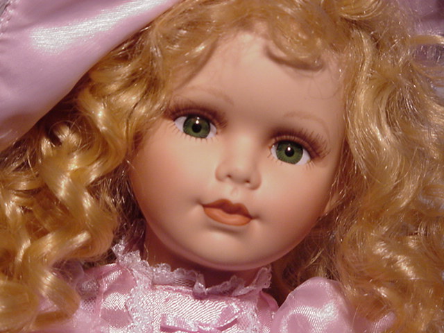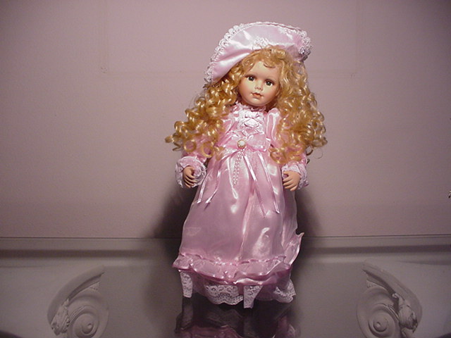 Nola is 16-1/2" tall and has brilliant green eyes. Her lovely pink dress is trimmed with white lace. Her hat is detailed with a small flower motif.