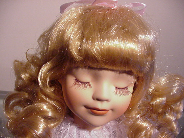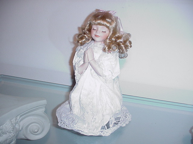 Judith is an angelic praying child. She is approximately 13" as she kneels in prayer. Her nightie is white, overlayed with white lace.