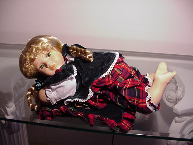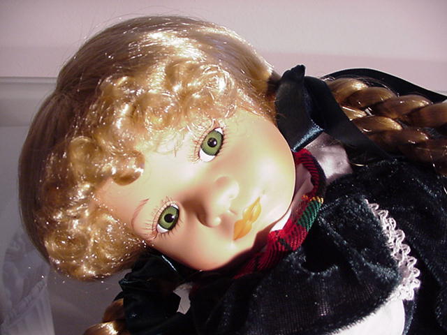 Canrie is a chubby little barefoot crawler. She's a gorgeous child, with blonde braids and green eyes. She's dressed in a warm red plaid, has a matching pillow, and is approximately 16" in length.