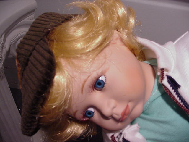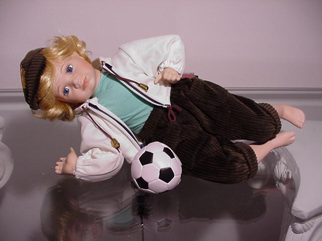 Christie is one of the cutest soccer kids you're likely to see. She has a hooded jacket over corduroy pants and cotton knit top. She's detailed right down to the zipper on her coat. She has a leather ball, and is ready to play! She is impressive at a length of approximately 18".