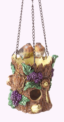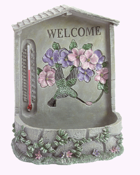 30100 Beckoning a cheery "Welcome" this pocket bird feeder boasts a thermometer and a hummingbird flitting among elegantly carved spring flowers. 6 1/4" x 3 1/2" x 8 1/4" high. $9.95 |