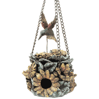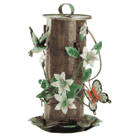 30261 Clinging vines and blossoms attract a butterfly and a hummingbird on this hanging metal bird feeder. A decorative accent to your garden. 5 3/4" diameter x 10" high. $11.95 |