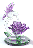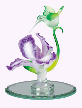 27106 Dipping into a purple-petaled blossom is a hummingbird with pretty purple wings! In sculptured glass, on a beveled glass mirror. 3" diameter base x 4 1/4" high. $14.95 |