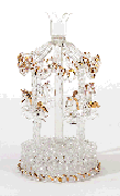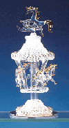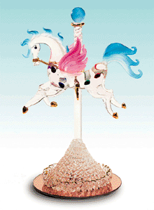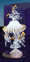 27107 Four prancing glass steeds chase each other around this intricate spun-glass merry-go-round. Golden trim accents manes, tails, canopy and base. 4 1/2" diameter, 8" high. $34.95 |