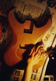 Varnish pure and simple! And before any of you smart arses out there complain at my choice of finish, remember I built this in my garden shed, or tried too. I used Ronseal quick drying varnish and guess what it did exactly what it said on the tin. I gave the guiat its high shine by working in bees wax with wire wool and a lot of hard graft. Its all paid off in the end and the finish gives the guitar a deep smooth shine.