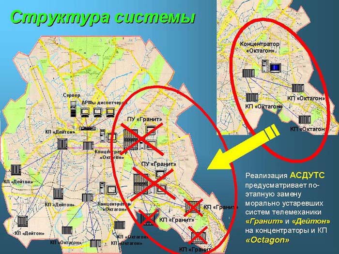 Реализация АСДУТС предусматривает по-этапную замену морально устаревших систем телемеханики "Гранит" и "Дейтон" на концентраторы и КП "Octagon".