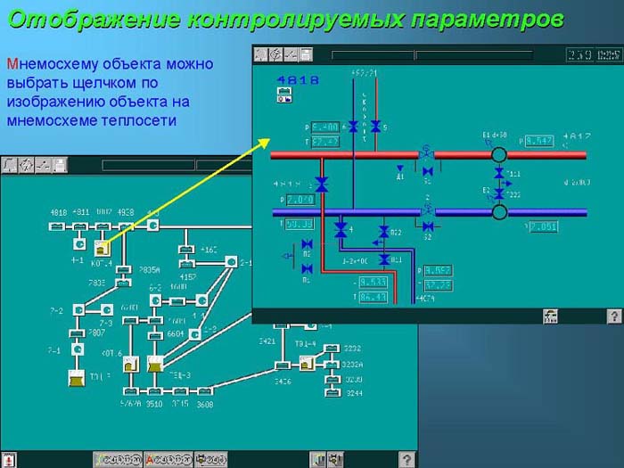 Мнемосхему объекта можно выбрать щелчком по изображению объекта на мнемо-схеме теплосети.