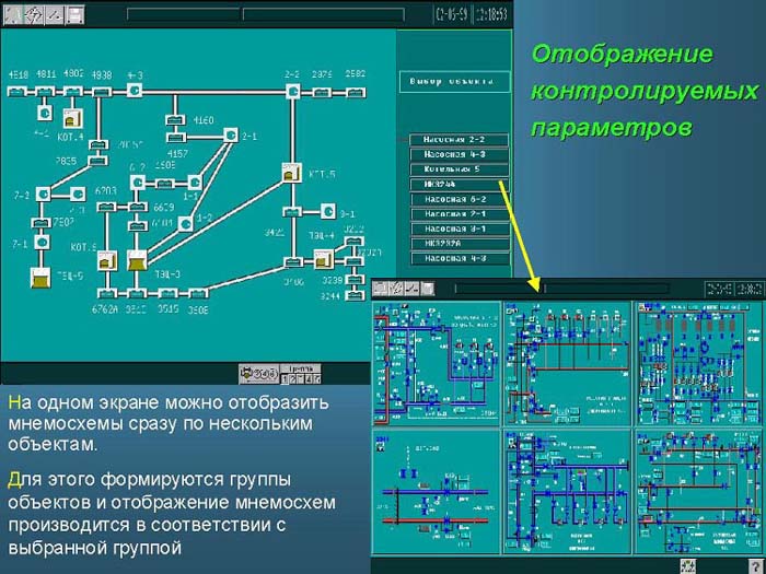 На одном экране можно отобразить мнемосхемы сразу по нескольким объектам. Для этого формируются группы объектов и отображение мнемо-схем производится в соответствии с выбранной группой.
