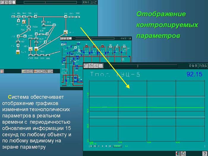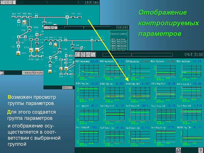 Система обеспечивает отображение графиков изменения технологических параметров в реальном времени с периодичностью обновления информации 15 секунд по любому объекту и по любому видимому на экране параметру. Возможен просмотр группы параметров. Для этого создается группа параметров и отображение осуществляется в соответствии с выбранной группой.