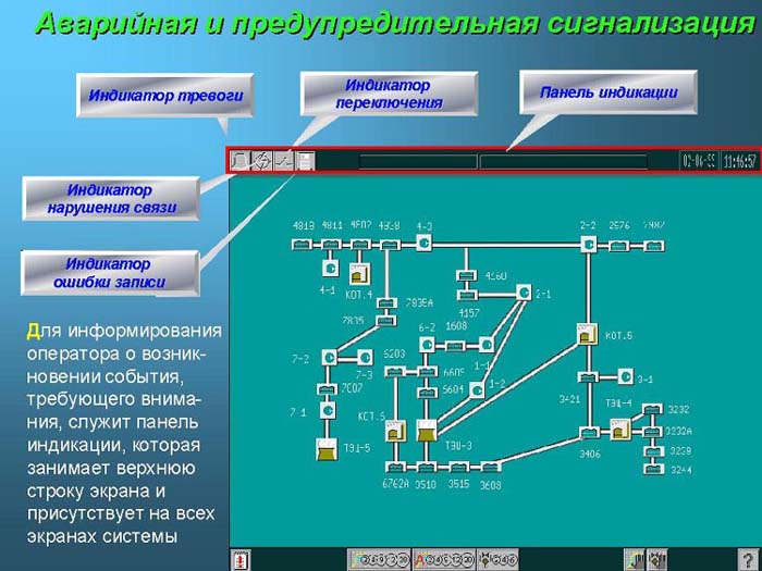 Для информирования оператора о возникновении события, требующего внимания, служит панель индикации, которая занимает верхнюю строку экрана и присутствует на всех экранах системы.