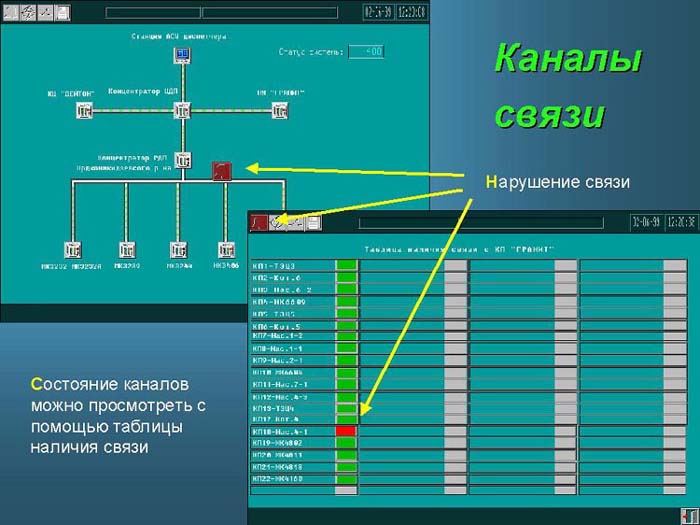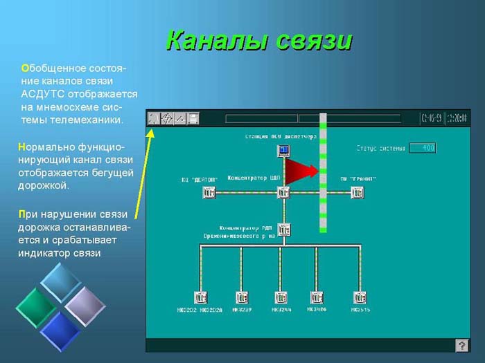 Обобщенное состояние каналов связи АСДУТС отображается на мнемосхеме системы телемеханики.