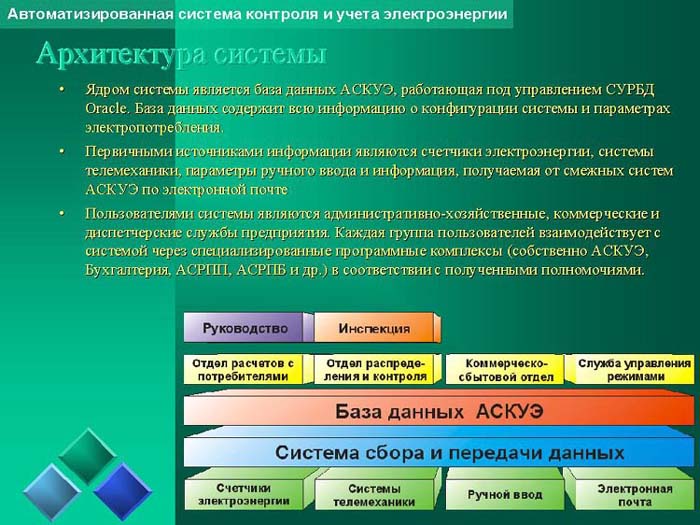 Пользователями системы являются административно-хозяйственные, коммерческие и диспетчерские службы предприятия. Каждая группа пользователей взаимодействует с системой через специализированные программные комплексы (собственно АСКУЭ, Бухгалтерия, АСРПП, АСРПБ и др.) в соответствии с полученными полномочиями.