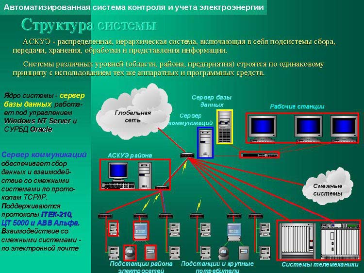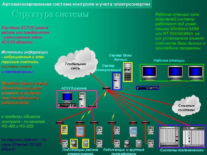 Структура системы. Системы АСКУЭ уровня района или предприятия - уменьшенные копии АСКУЭ области Источники информации - индукционные и электронные счетчики, системы учета и телемеханики. Передача данных между объектами осуществляется по выделен-ным телефонным и радиоканалам, в пределах объекта контроля - по каналам RS-485 и RS-232, на верхних уровнях - по сети Ethernet 10/100 Мбит/с. Рабочие станции пользователей системы работают под управлением Windows 95/98 или NT Workstation, на них установлена клиентская часть базы данных и прикладные программы.