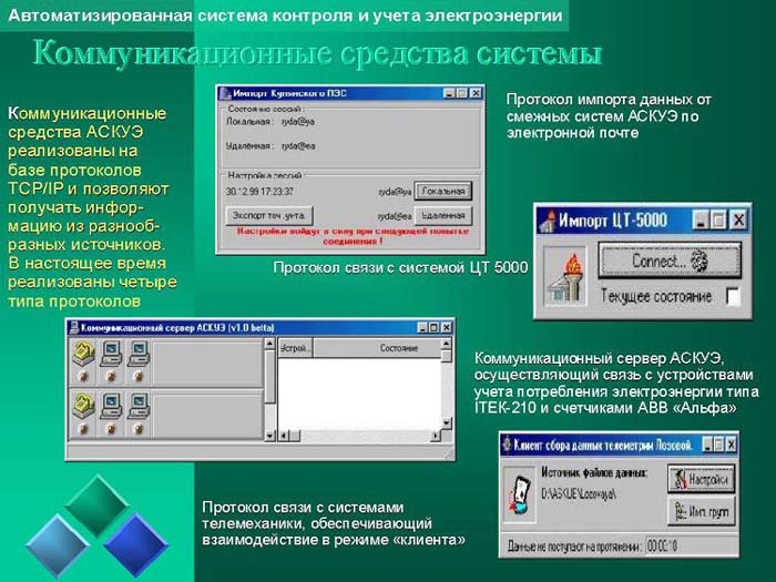 Коммуникационные средства АСКУЭ реализованы на базе протоколов TCP/IP и позволяют получать информацию из разнообразных источников.