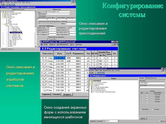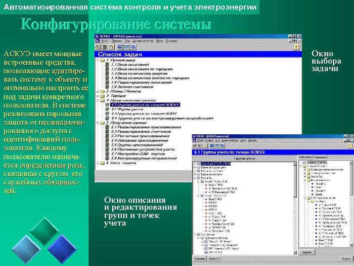 Конфигурирование системы. АСКУЭ имеет мощные встроенные средства, позволяющие адаптировать систему к объекту и оптимально настроить ее под задачи конкретного пользователя. В системе реализована парольная защита от несанкционированного доступа с идентификацией пользователя. Каждому пользователю назначается определенная роль, связанная с кругом его служебных обязанностей.
