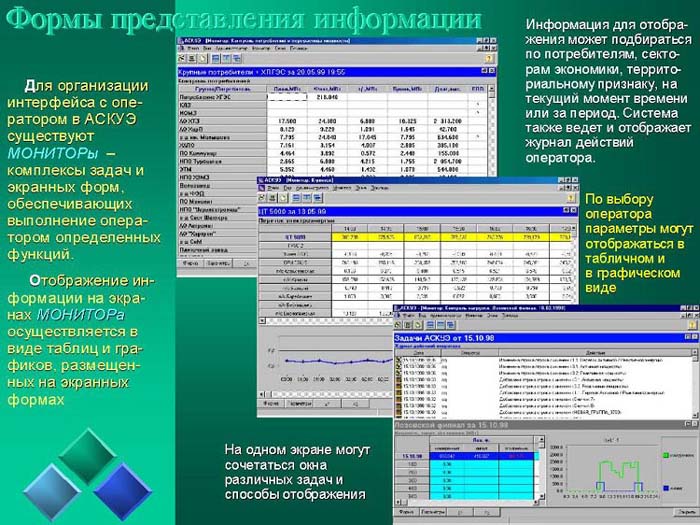 Отображение информации на экранах МОНИТОРа осуществляется в виде таблиц и графиков, размещенных на экранных формах. В АСКУЭ реализована мощная система создания отчетов. Созданные с учетом требований к отчетной документации, принятым на предприятии, они значительно облегчают труд персонала и исключают возможность появления ошибок.