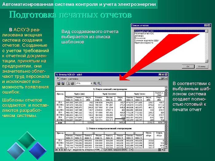В АСКУЭ реализована мощная система создания отчетов. Созданные с учетом требований к отчетной документации, принятым на предприятии, они значительно облегчают труд персонала и исключают возможность появления ошибок.