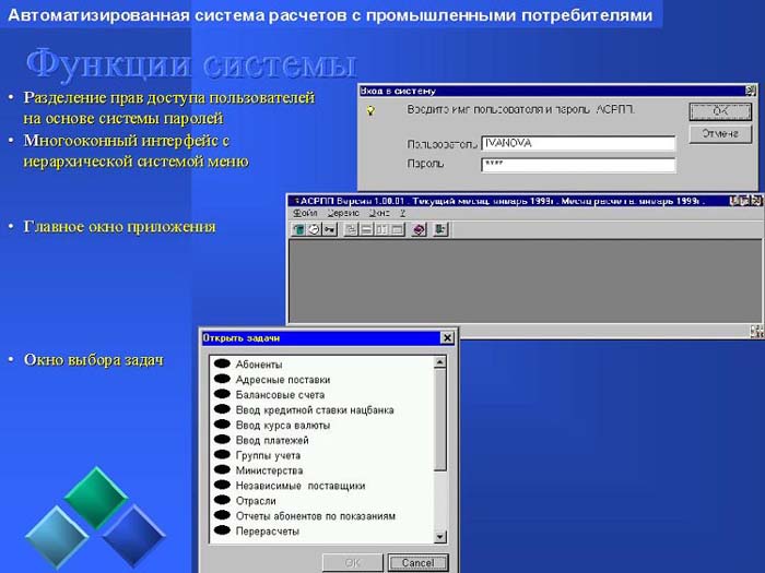 Разделение прав доступа пользователей на основе системы паролей.